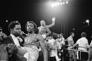 While Hearns’ dream lies broken in total exhaustion, there behind him is the contrast of a champion, raised aloft in triumph – a victory all the sweeter in having been taken to the brink.
